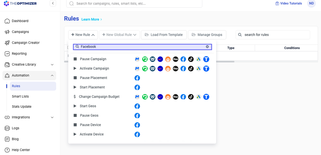 When you click New Rule, the system loads all available rule types for every ad network you have connected. If you have Facebook, TikTok, and Taboola connected, you'll see rules for all three in one list.