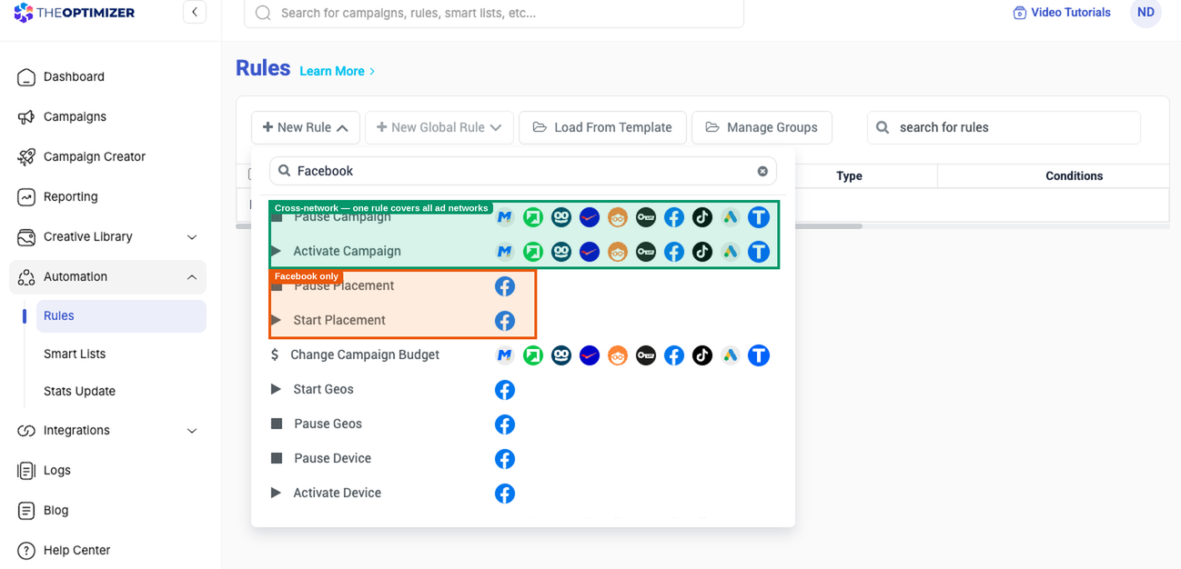 ℹ️ Cross-network rules: Rules supported by multiple networks can be applied to campaigns from different ad networks within a single rule. For example, if your Pause Campaign logic is the same for Facebook and TikTok, you can create one rule and add campaigns from both networks to it — rather than maintaining two separate rules.