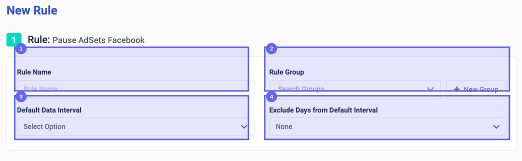Pause Ads – Spend > $50 & 0 Convtells you everything at a glance;Rule 1tells you nothing. As your rule library grows, self-explanatory names save a lot of scrolling. - Rule Group — (Optional) Assign the rule to a group. Beyond keeping your dashboard tidy, groups let you bulk-assign rules to campaigns later without selecting them one by one.