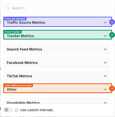 When browsing metrics in the dropdown, they are organized into three categories: