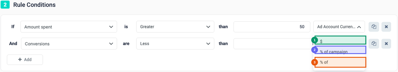 | % of Campaign | Compare against a campaign-level metric. Example: "Spend is greater than 20% of Campaign Daily Budget." |