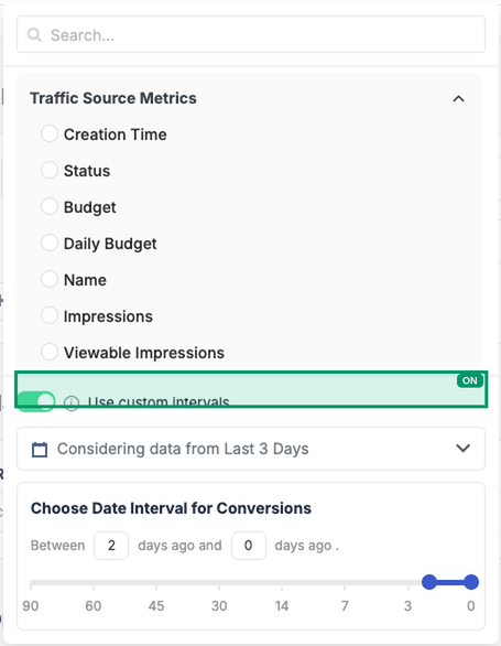 TodayandYesterdaytoLast 3 Days,Last 7 Days, all the way toLast 90 Days. Every condition in the rule will use this interval unless you override it individually (see Section 3). - Exclude Days from Default Interval — Removes specific recent days from the evaluation window. For example, if your revenue data arrives with a 24-hour delay (common in Search Arbitrage), excluding