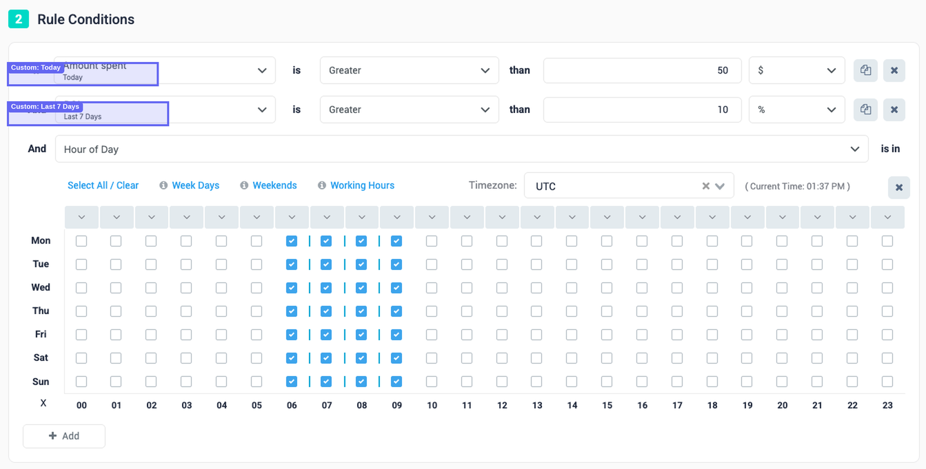 ℹ️ Example: Mixed time frames — Check whether an ad has spent money Today, while also checking its ROI over the Last 7 Days. Set the global interval to Last 7 Days, then give the Spend condition a custom interval of Today.