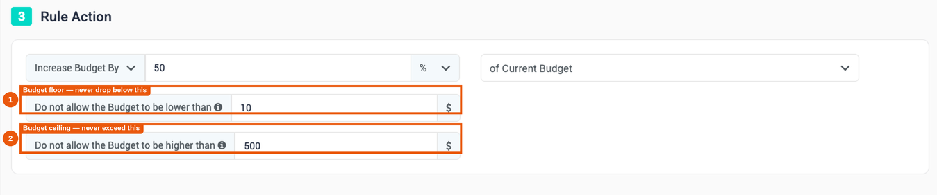 - Min Budget (Floor) — The rule will never reduce the budget below this value, even if the decrease amount would go lower.