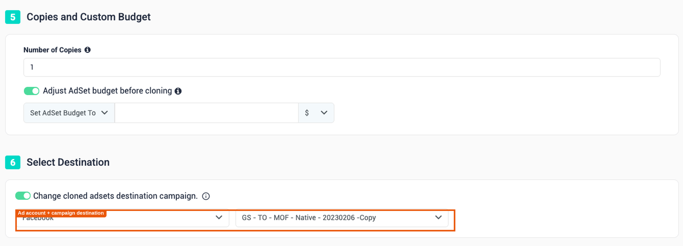 - Destination — By default, clones land in the same campaign. Enable Change Cloned Ad Destination to redirect them to a specific adset, campaign, or even a different ad account.