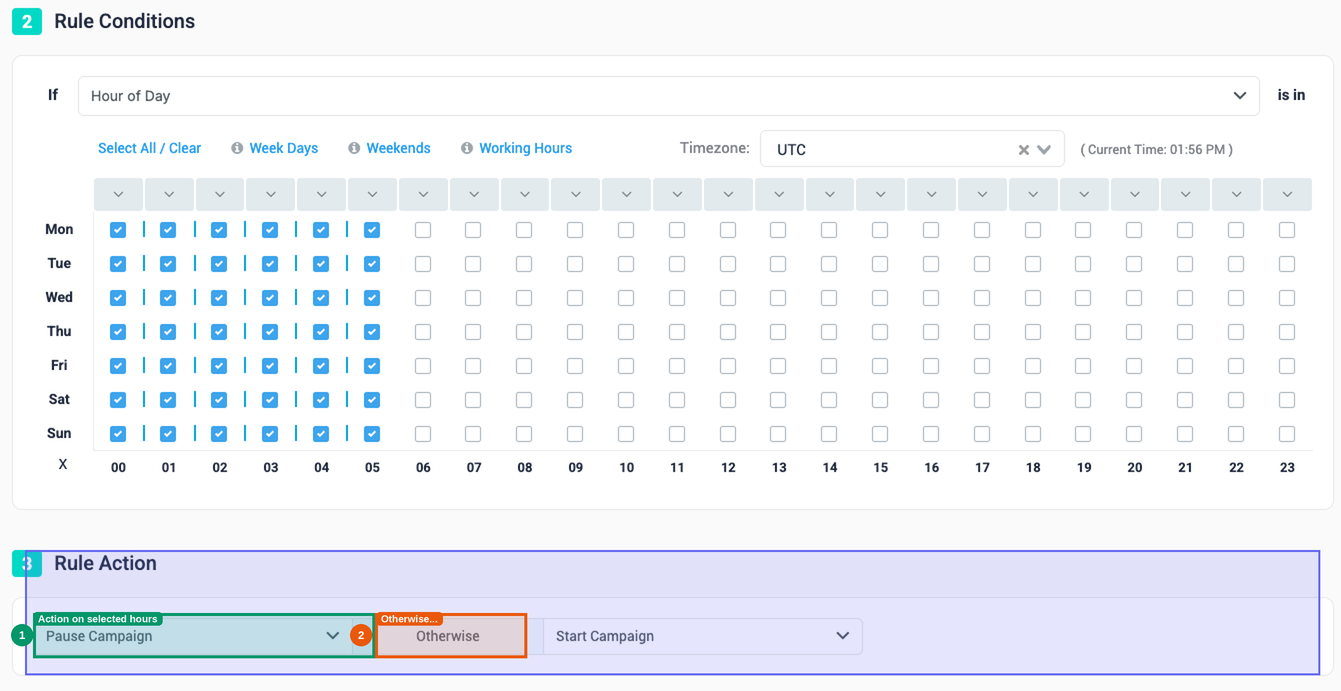| Pause on selected hours, otherwise do nothing | Pauses during selected hours only. Outside those hours, the campaign is left in its current state. |