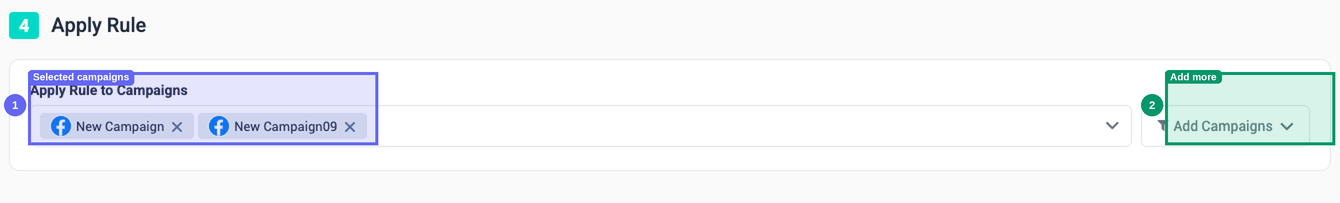 ℹ️ Note: If you are creating a Global Rule, this section asks you to select Ad Accounts instead of individual campaigns.