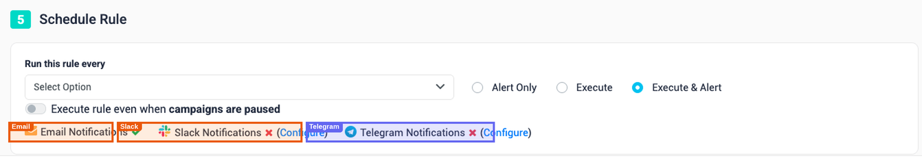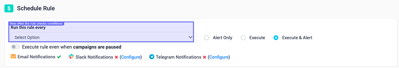 Every rule — regardless of whether it acts on ads, adsets, or campaigns — requires you to specify which campaigns it monitors. The rule evaluates entities within those campaigns only.