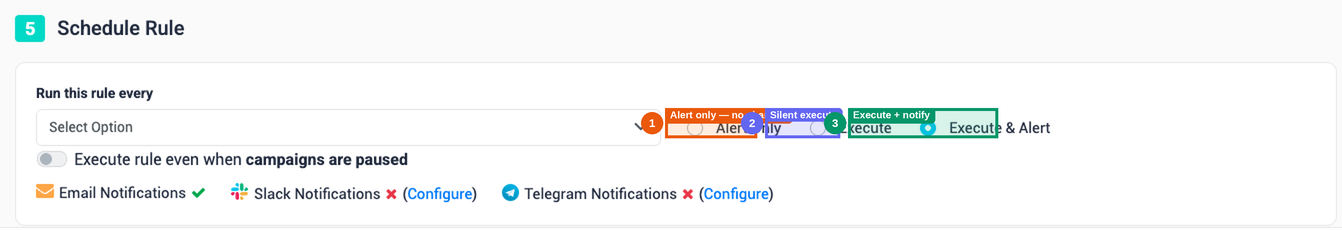 💡 How to build a pure monitoring rule (Alert Only): You can turn any rule type into a monitoring-only rule by selecting Alert Only. The rule type itself doesn't matter — what matters is the level (campaign, ad, adset) and the conditions. Create a "Pause Ads" rule, define your conditions, set it to Alert Only, and you'll be notified when matches occur without anything actually being paused.
