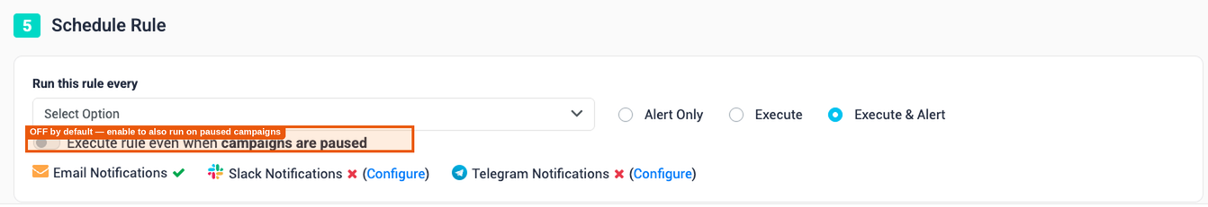 Toggle Run on Paused Campaigns to ON only when you specifically need a rule to monitor paused entities — for example, a rule that reactivates an ad if late conversions arrive after it was paused.