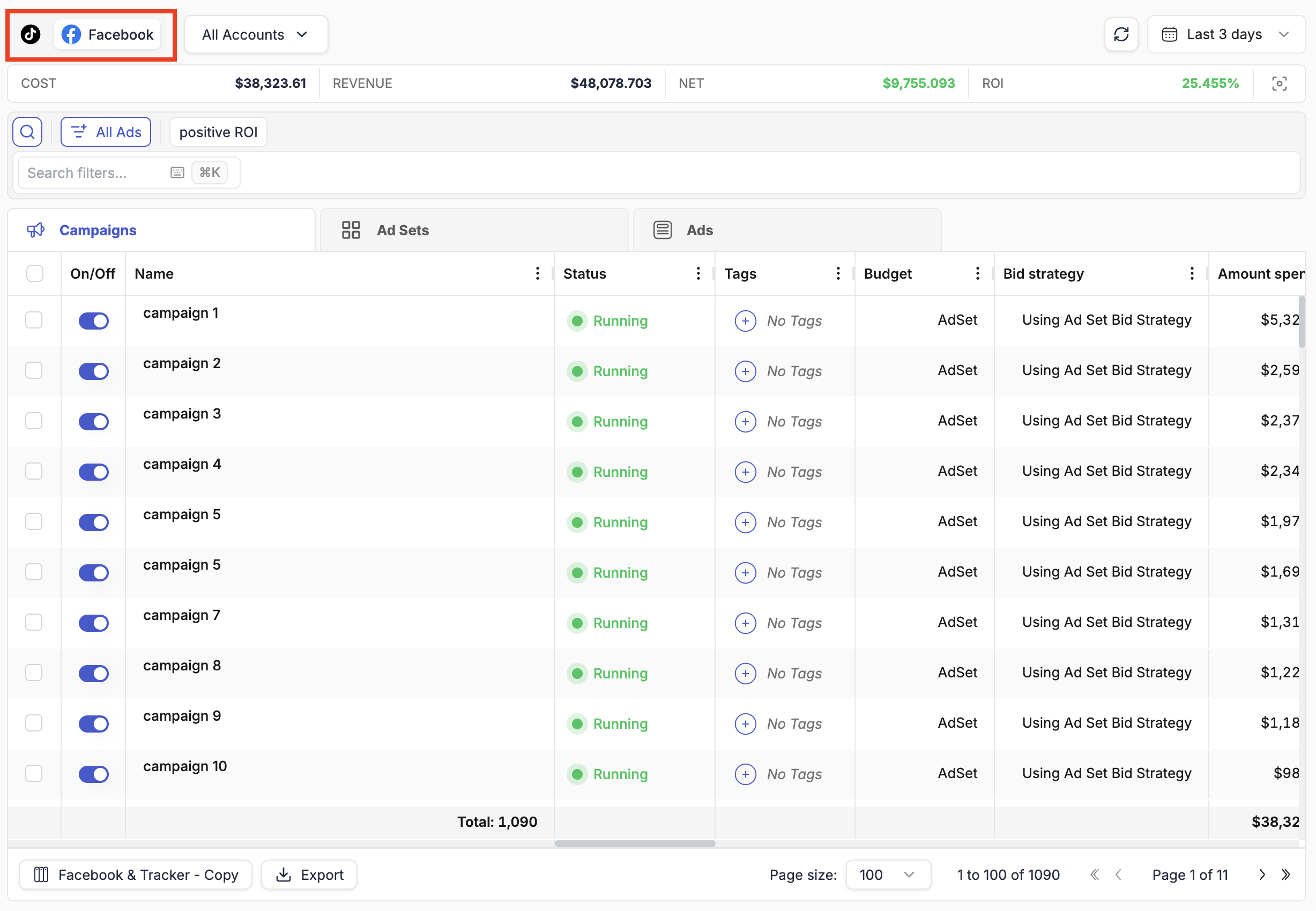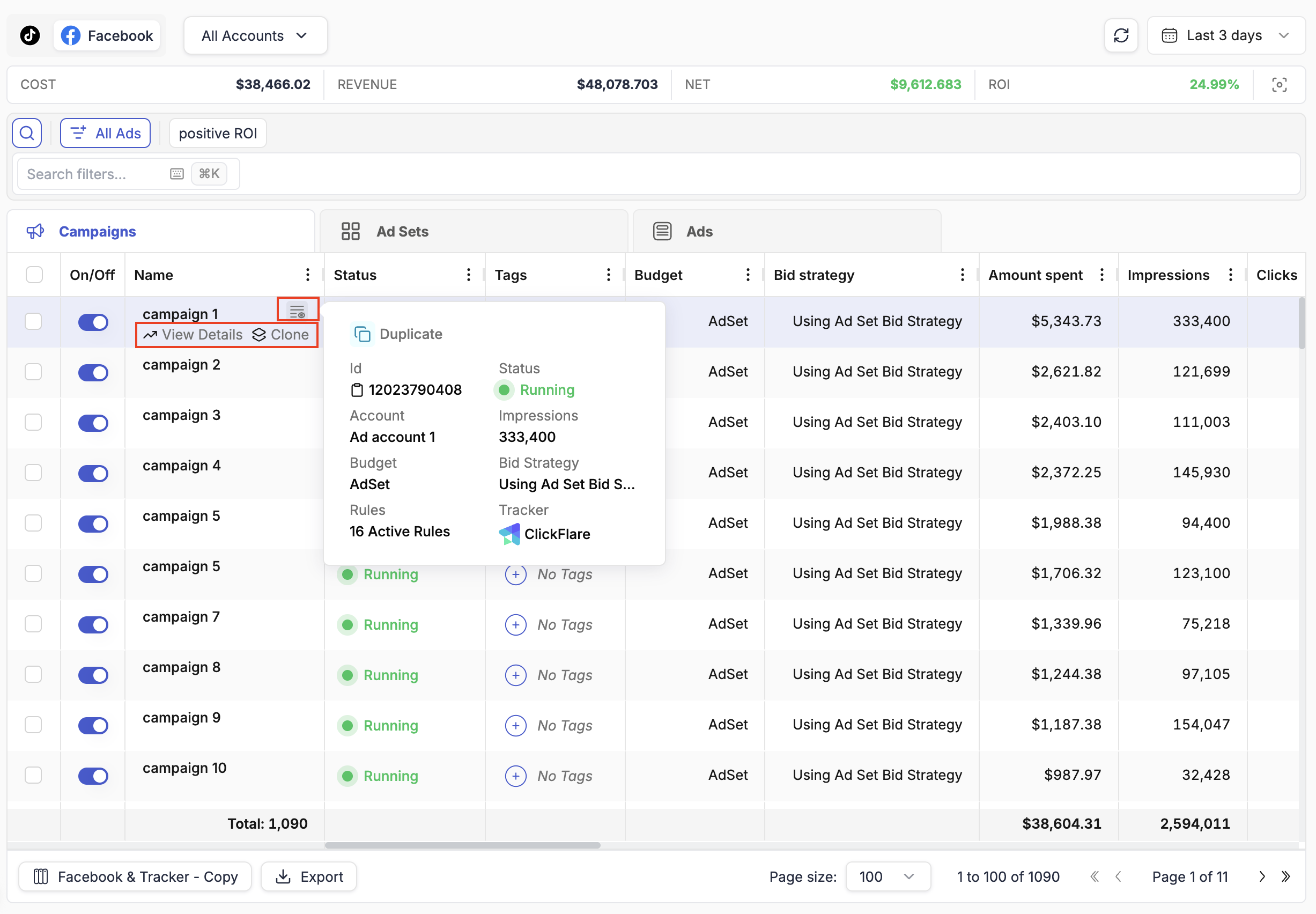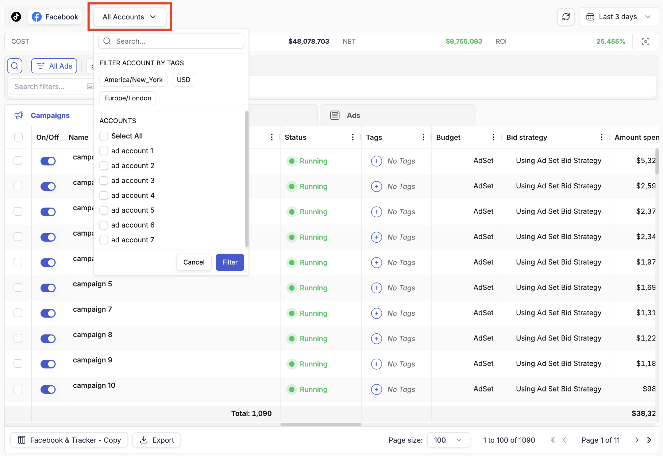 - Cross-account visibility — view and manage campaigns, ad sets, and ads across all connected accounts in one table.