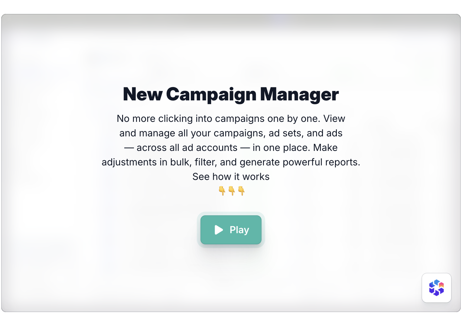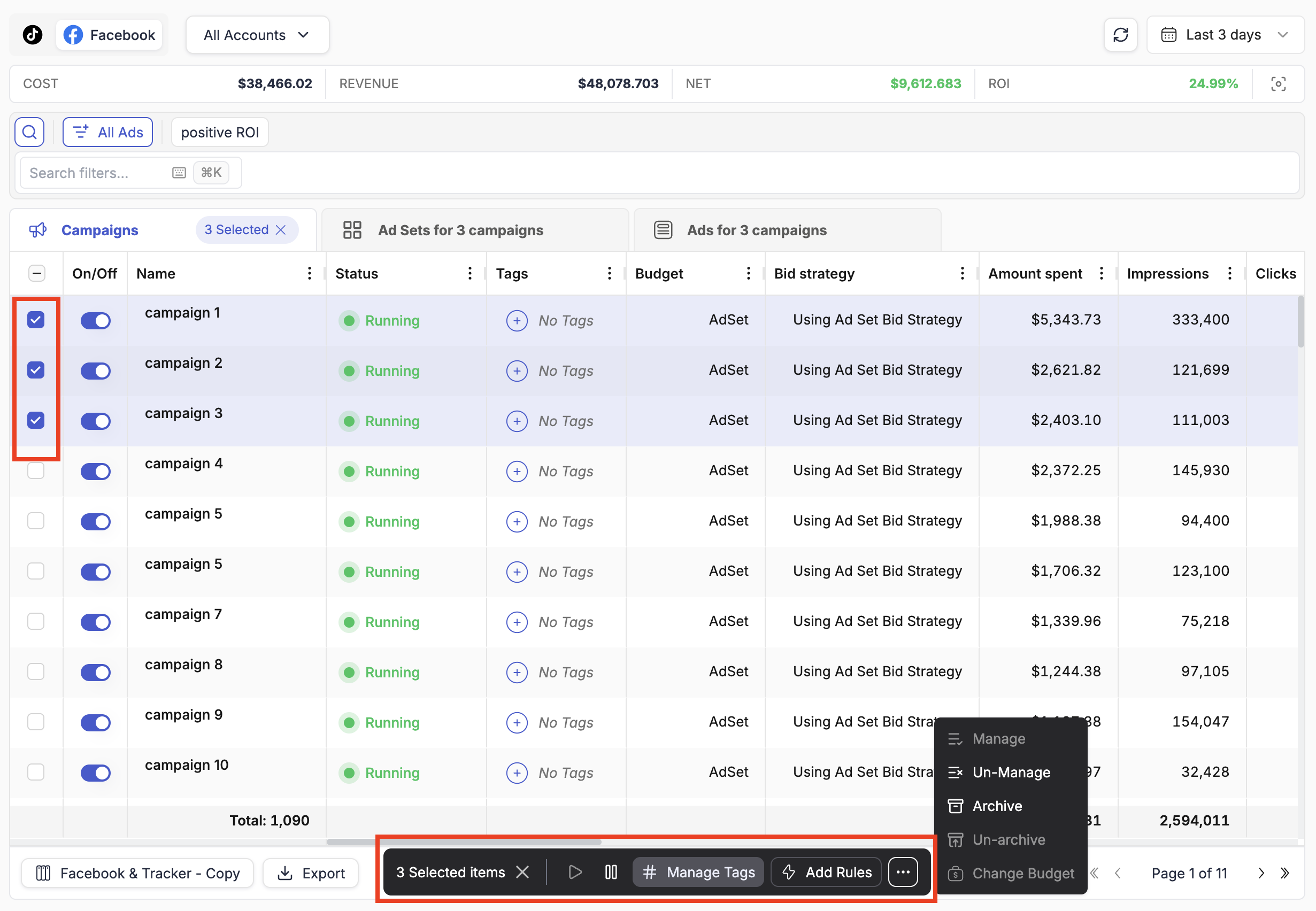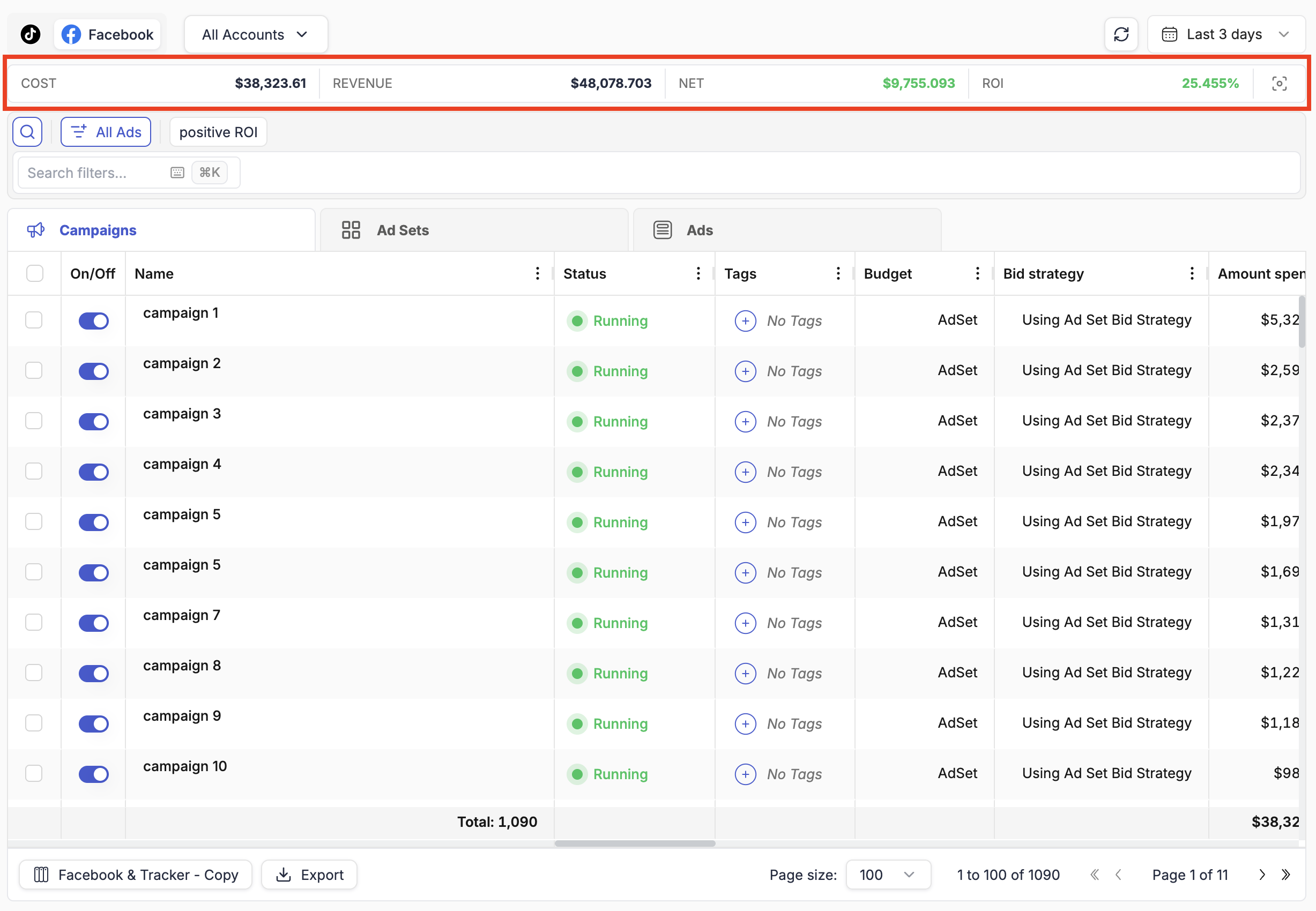 - Cross-account visibility — view and manage campaigns, ad sets, and ads across all connected accounts in one table.