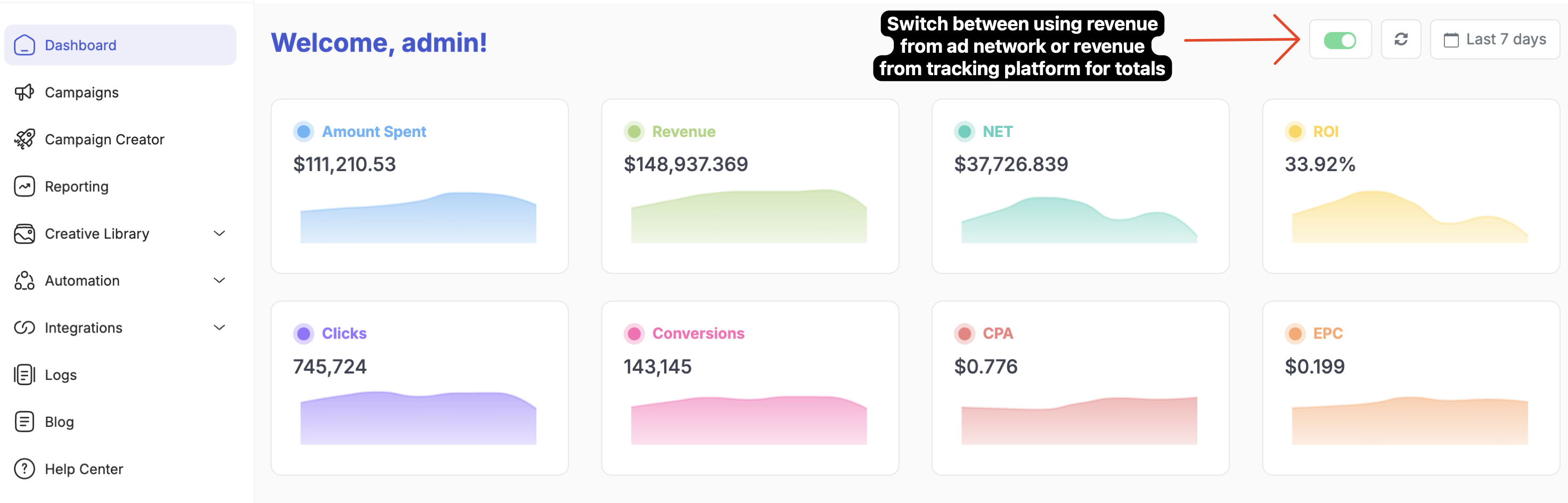 💡 Tip: If you see $0.00 in the Revenue column despite having active campaigns, the most likely cause is that you have the Ad Network Revenue option selected but are not pushing revenue data to the traffic source. Switch to Tracker Revenue on the Dashboard and the correct figures will appear across the board.
