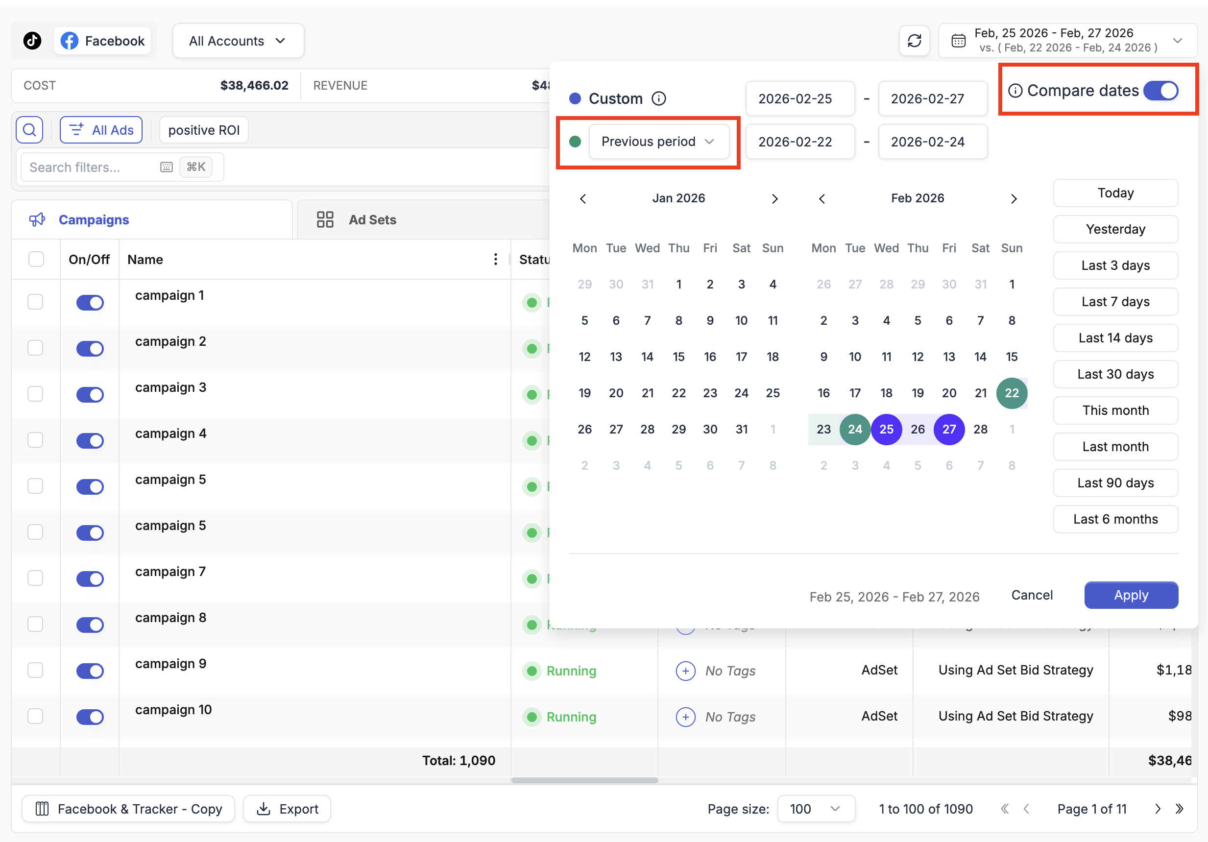 Once set up, when you activate Compare Dates in the date picker (Section 4), each selected compare column will display an additional column in the table showing the value for the comparison period. This makes it easy to see at a glance whether spend went up, conversions dropped, or ROI improved between the two periods.
