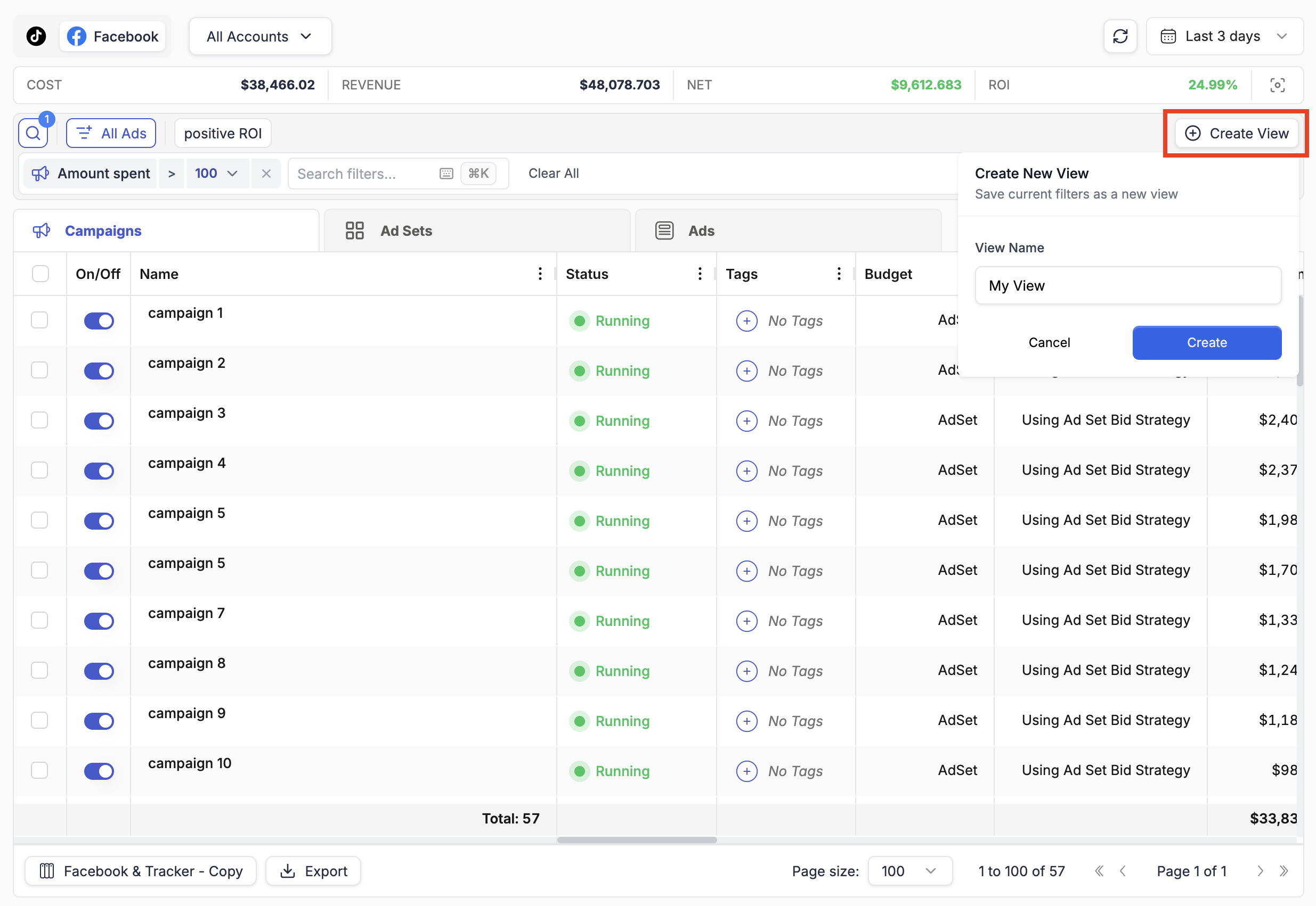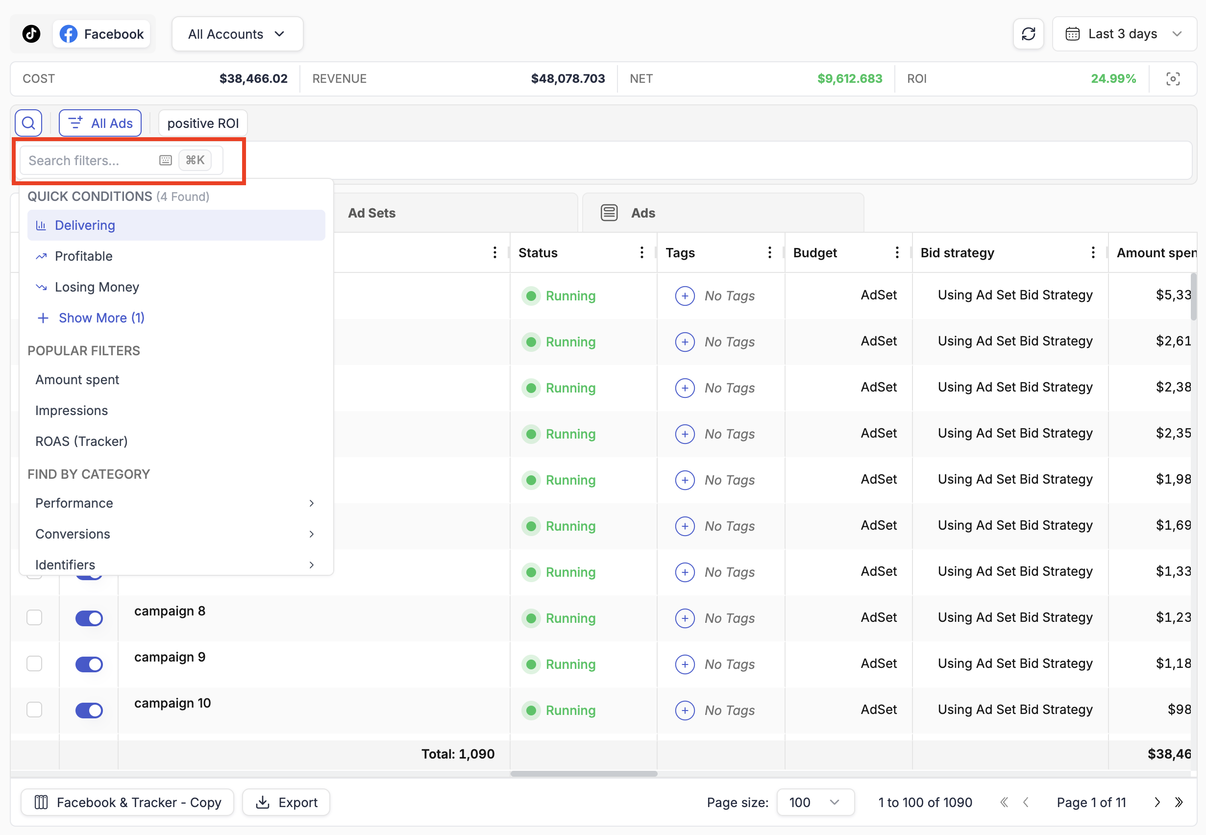💡 Tip: Create views for your most common morning review filters — for example, a "Profitable" view per network, or a "High Spend / No Conversions" view for catching wasted budget fast.