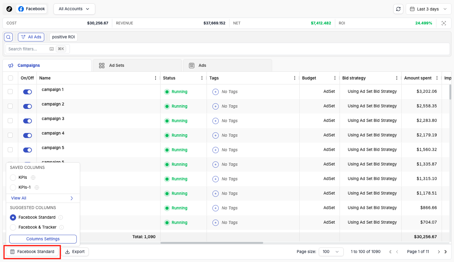 - Facebook Standard — the essential Facebook ad network metrics only (no tracker data). This is a clean, focused view when you want to see native Facebook performance without additional columns.