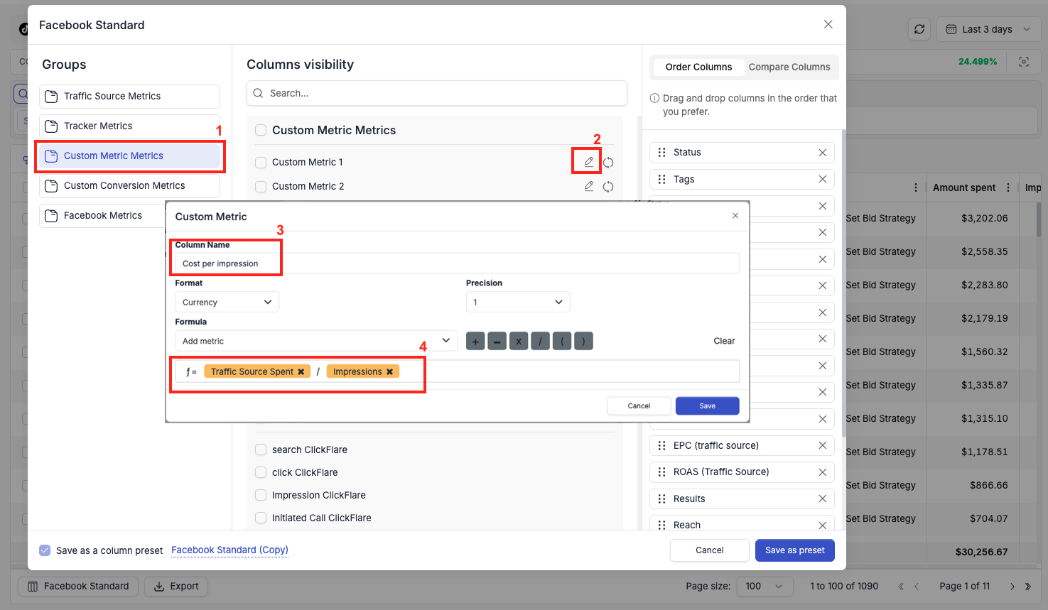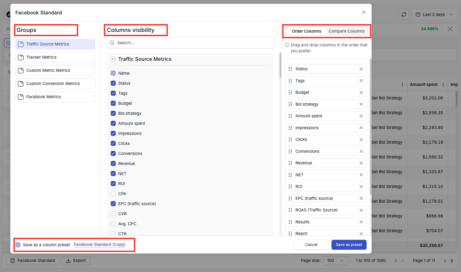 💡 Tip: Create different column presets for different workflows — for example, a "Daily Review" preset with spend, CPA, and ROI, and a separate "Creative Testing" preset focused on CTR, CPM, and click-through rate.