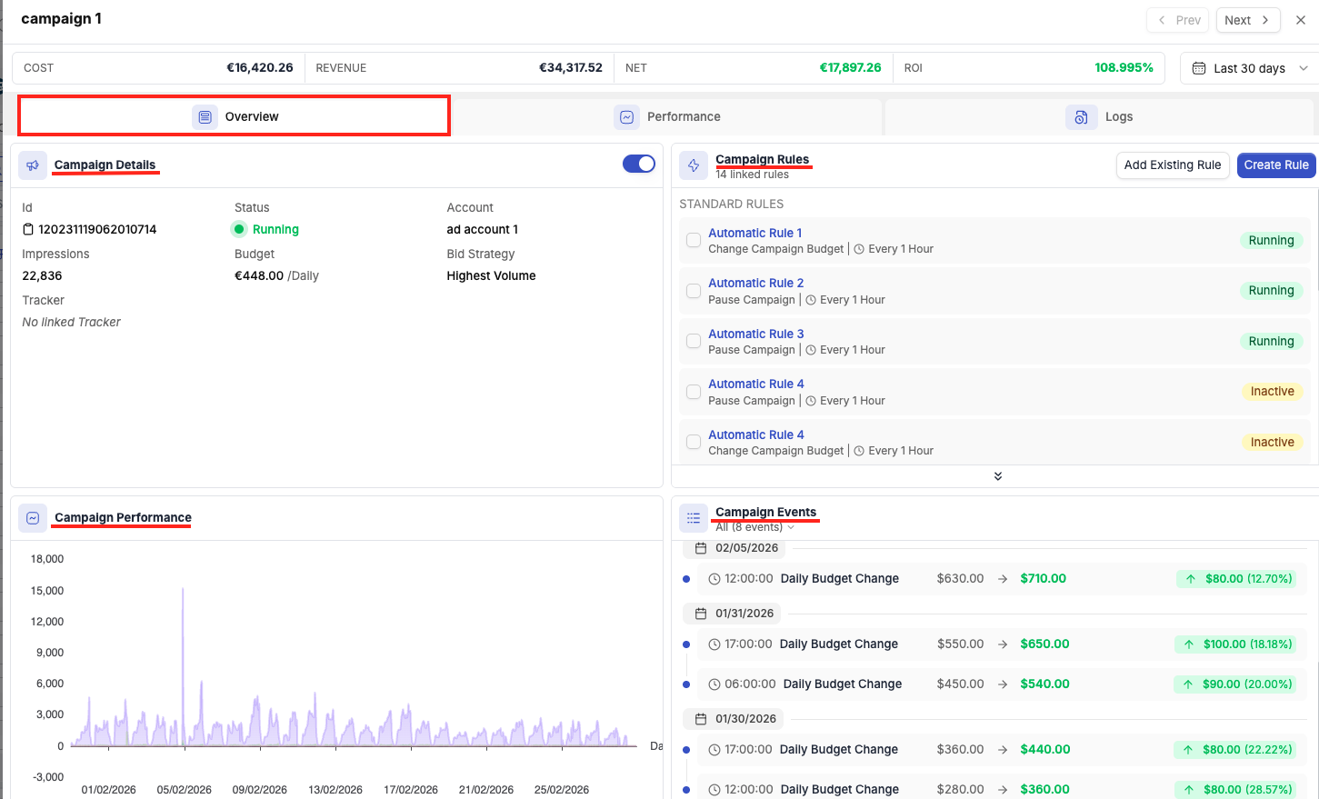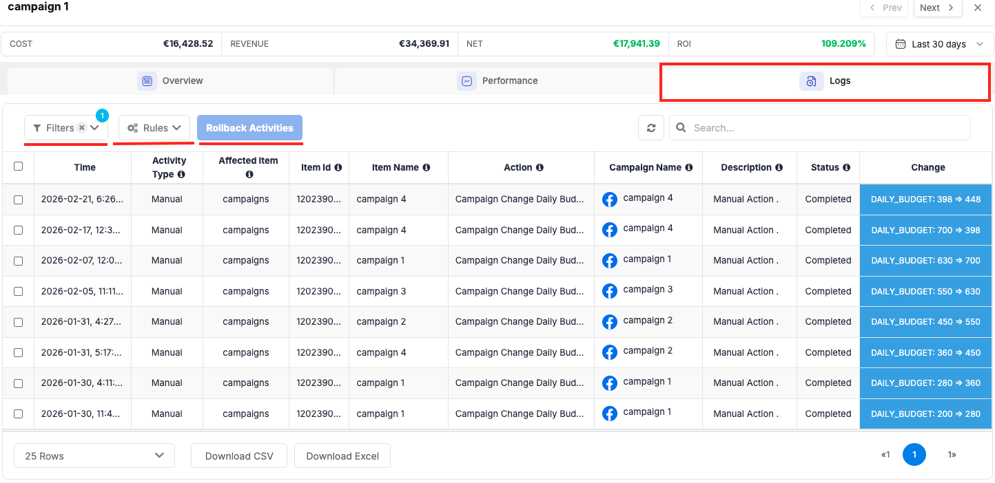 💡 Tip: The Logs tab is invaluable when you need to investigate why a campaign's performance changed unexpectedly. Cross-reference the log timestamps with the Campaign Performance chart in the Overview tab to understand what action preceded the change.