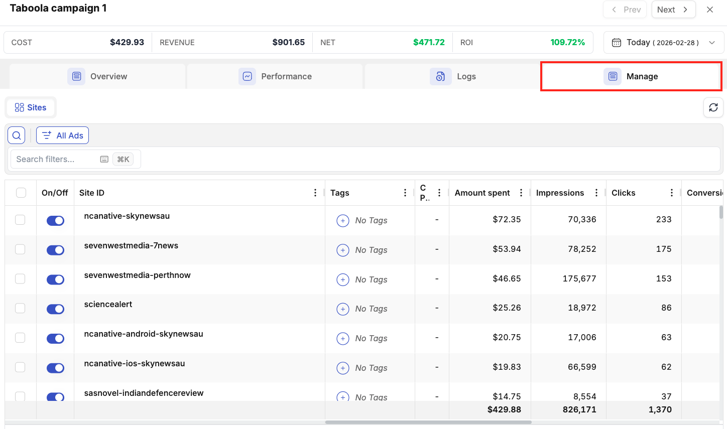 - Taboola → Manage Tab — shows performance broken down by individual publisher site. Use this to identify which sites are driving results and which are wasting spend. From this view you can pause underperforming sites directly without navigating away.