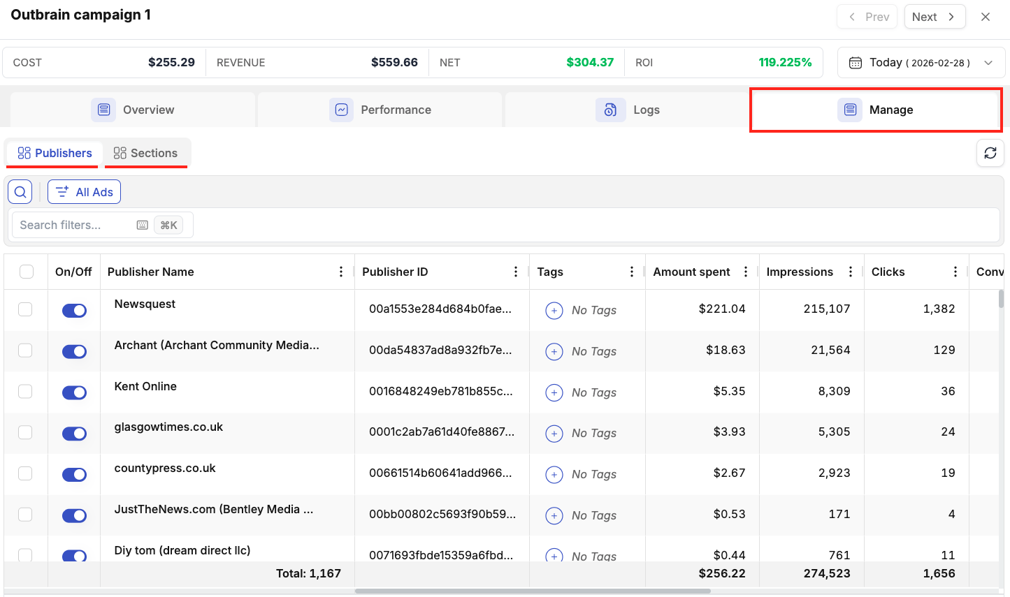 - Outbrain → Manage Tab — shows performance breakdown by publisher and by section within each publisher. Use this to identify which publishers or sections are driving results and which are wasting spend. From this view you can pause underperforming publishers or sections directly without navigating away.