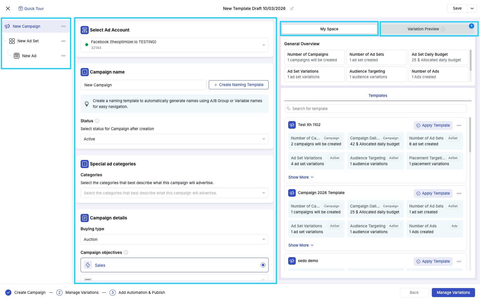 💡 Tip: Most media buying teams repeat similar campaign structures daily. Save your first build as a template and every subsequent launch becomes a matter of minutes — even for complex multi-variation, multi-account structures.