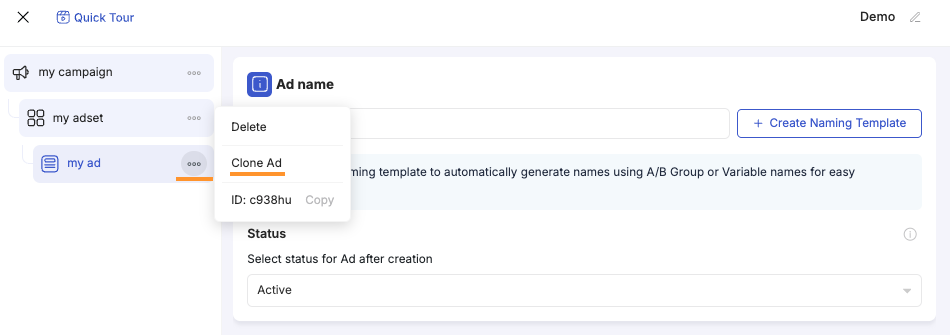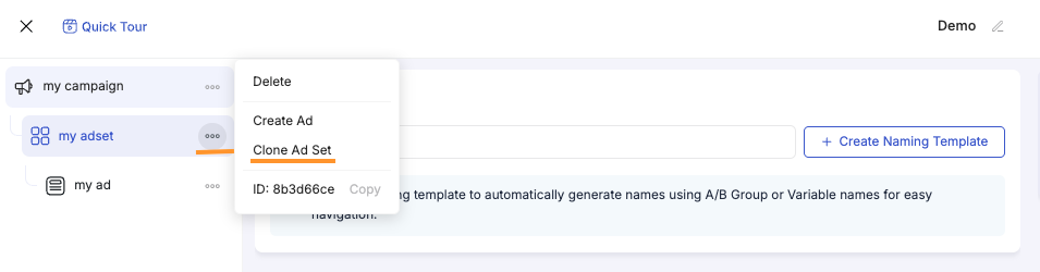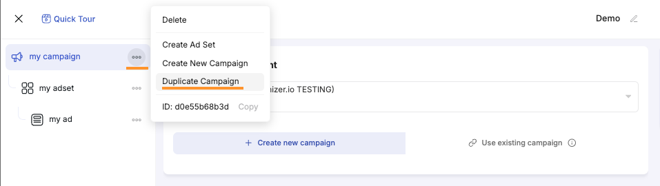 Left panel — Campaign tree. A tree structure showing your campaign hierarchy: Campaign → Ad Set → Ad. Click any level to navigate to its settings. Use the three-dot menu (⋯) on any item to duplicate, create new, or rename.