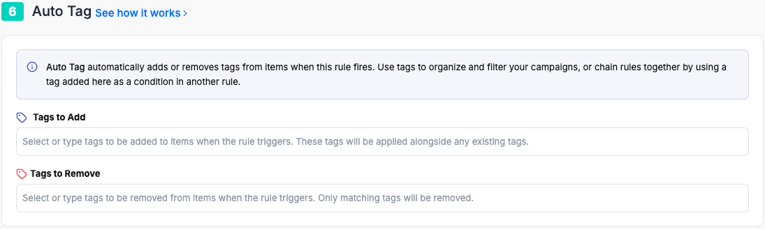 - Tags to Add — one or more tags that will be applied to every item the rule acts on when it fires.