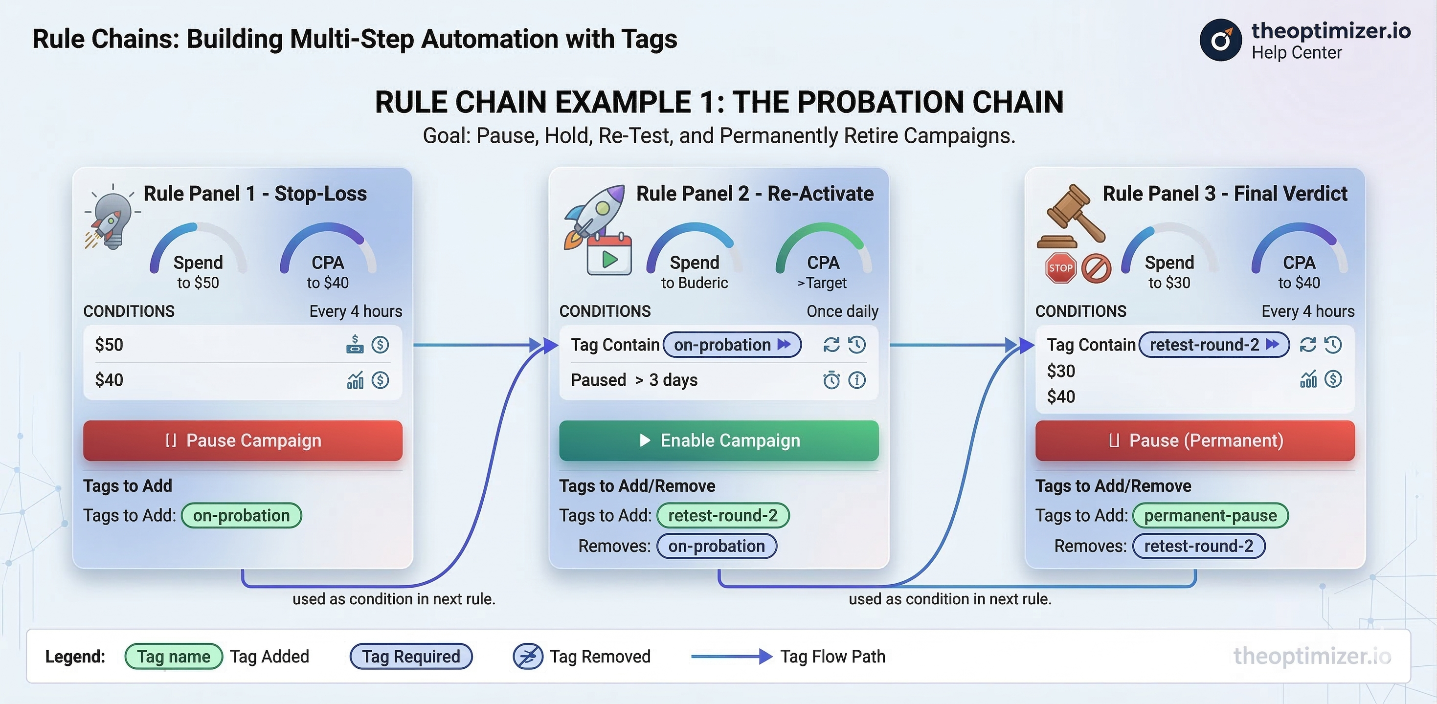 Every rule in TheOptimizer can be configured to add or remove tags from the items it acts on (campaigns, ad sets, ads, or sites). These tags then become available as conditions in other rules, so you can create logic like:
