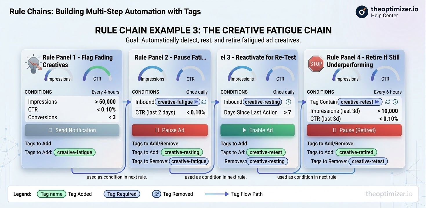 Action: Pause Ad Tags to Add: creative-resting Tags to Remove: creative-fatigue Schedule: Every 6 hours